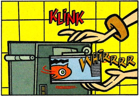 Only her hands were shown in the comic Up a Tree, she wore a large orange bracelet on her right wrist.